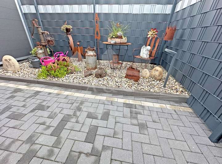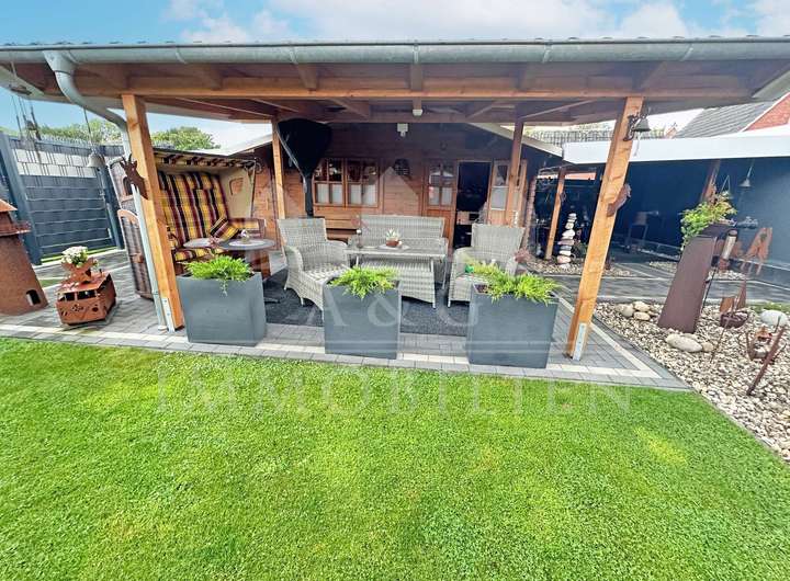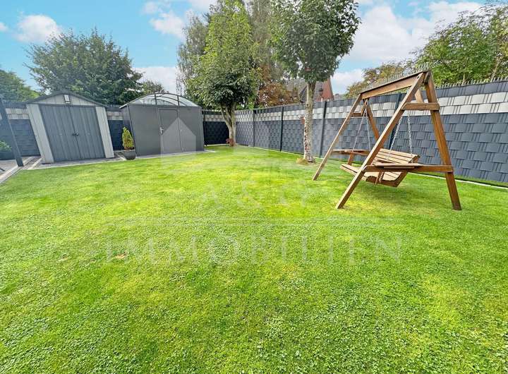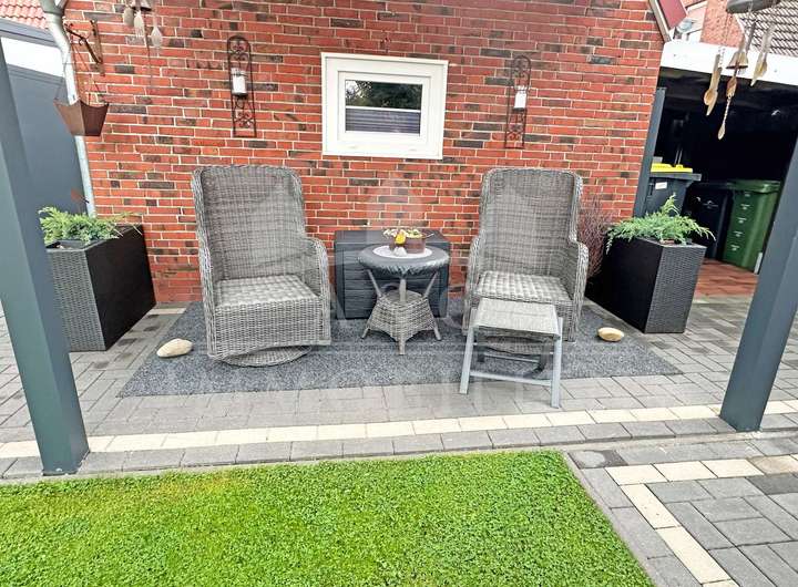 Der gepflegte Garten bietet sowohl Entspannung als auch Funktionalität – ideal für Paare oder kleine Familien, die Wohnkomfort und ein harmonisches Zusammenspiel von Innen- und Außenbereich schätzen.