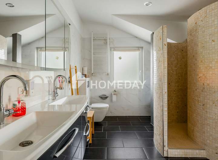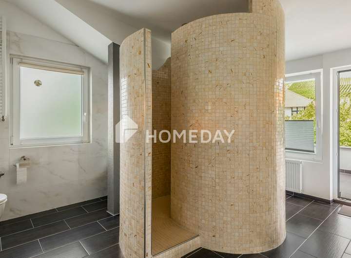 Das gehobene Tageslichtbad der hier gezeigten Wohnung ist mit einer Dusche aus Mosaiksteinen und einem Handtuchwärmer ausgestattet. Die Präsenz des Balkons am Bad erhöht den Wohnkomfort und ermöglicht Ihnen eine direkte Verbindung zur Natur und zum Außenbereich.
