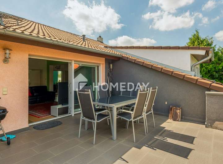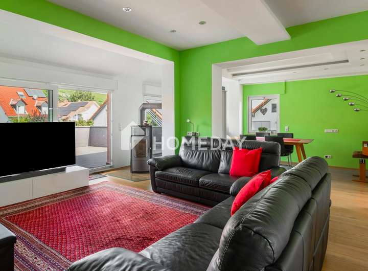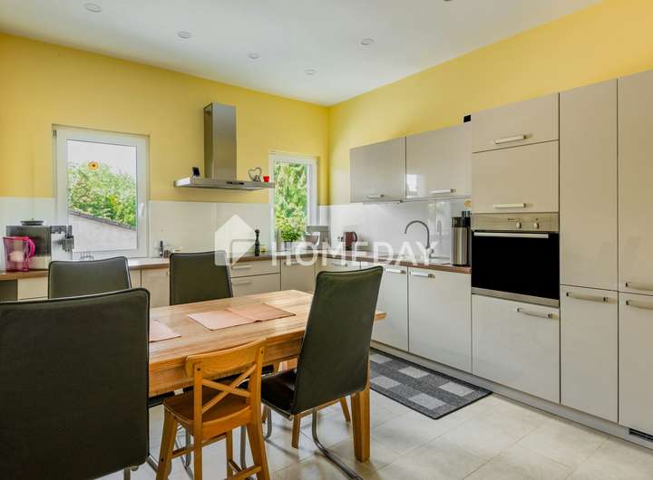 Das Objekt präsentiert sich im Inneren mit gehobener Ausstattung. Besonders hervorzuheben sind die perfekt ausgestattete Einbauküche mit Markengeräten und das beeindruckende Wohnzimmer mit Kamin. Die große Fensterfront sorgt für viel Tageslicht.