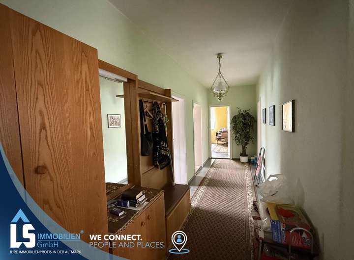 Im Obergeschoss erwartet Sie eine großzügige Wohnung mit sieben Zimmern, einer voll ausgestatteten Küche und einem funktionstüchtigen Badezimmer. Besonders hervorzuheben ist der breite, helle Flur, von dem alle Räume abgehen – perfekt für Familien, die viel Platz benötigen.