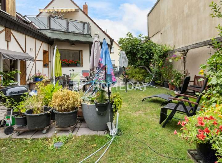Der Außenbereich überzeugt durch einen liebevoll angelegten, pflegeleichten Garten und eine rund 25 Quadratmeter große Terrasse mit östlicher Ausrichtung, die zu sonnigen Stunden im Freien einlädt. Ein Stellplatz auf dem Grundstück sorgt für bequeme Parkmöglichkeiten.