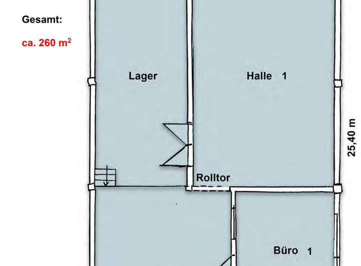 Hintere Hälfte der Halle ist "tiefergelegt" um ca. 75 cm, das erhöht die Raumhöhe nochmals. Es gibt ein Rolltor zum