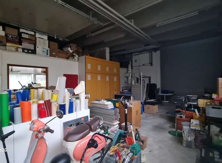 3. Gewerbehalle, ca. 260 qm. Sehr hohe Deckenhöhe, eingezogene Zwischenwände könnten wieder entfernt werden.