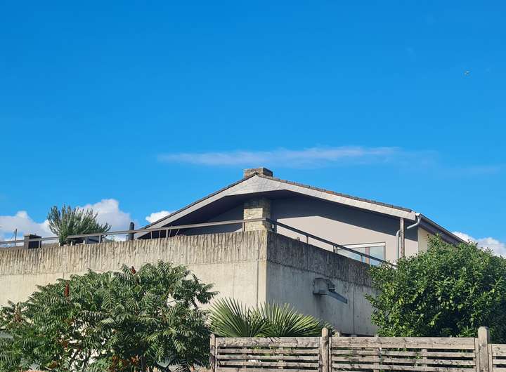 Der große Dachgarten hat um die Rasenfläche noch eine hübsche Bepflanzung erhalten. Eine kleine Abstellkammer, sowie ein Speicher runden das Bild ab.