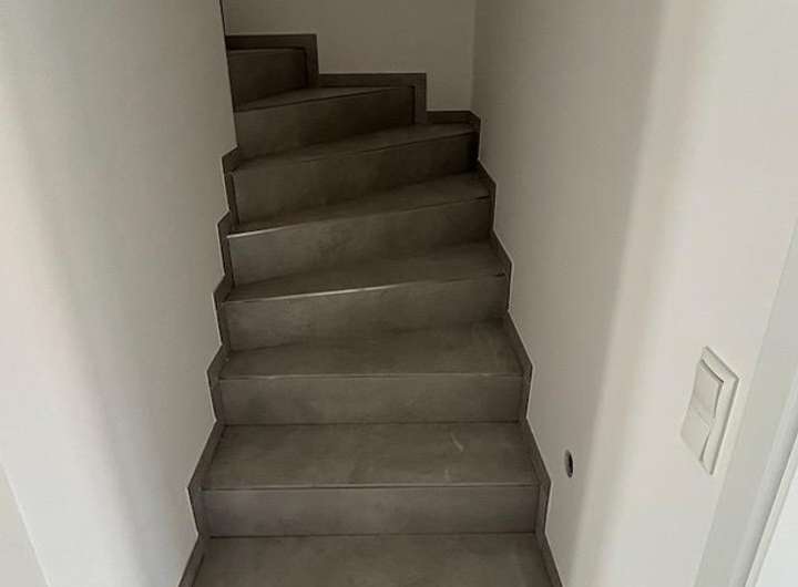 •Moderne Großformat-Fliesen im gesamten Erdgeschoss sowie auf der Betontreppe