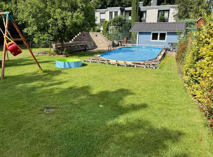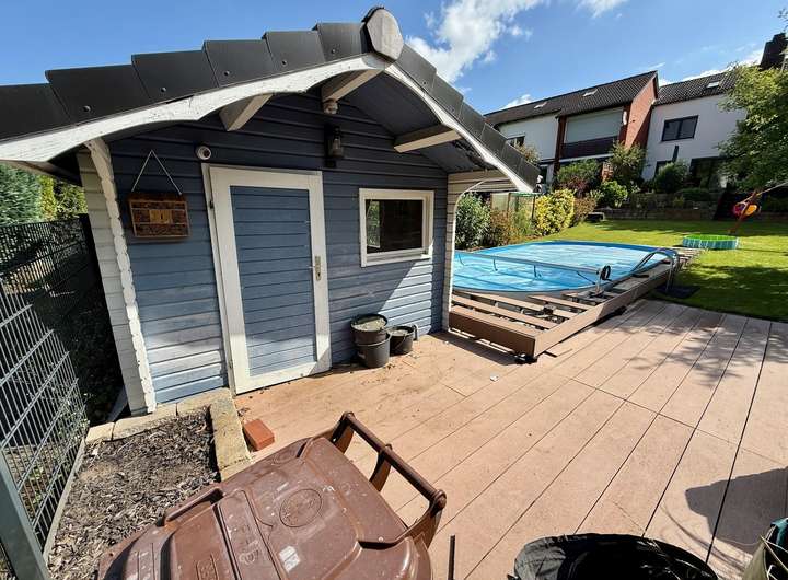 Balkon, Terrasse, Garten, Keller, Vollbad, Duschbad, Pool · Schwimmbad, Einbauküche, Gäste-WC, Kamin Bemerkungen: Dieses Zuhause ist mehr als Standard - es ist ein Wohn-Traum mit Wohlfühlfaktor: • Neubauqualität (Fenster mit Elektrischen Rolläden, Türen, Dämmung, Abgehangene Decken in den Bädern) • Automatische Steuerung des Hauses (Wärme, Licht, Bewässerung) • Hohe Sicherheitsstandards • Gartenparadies • liebevoll gestaltet • großer ovaler Pool (ca. 3,5 × 7,5 m) • Kaminkasette im Wohnzimmer für gemütliche Stunden