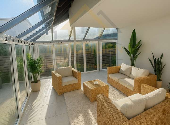 Bezaubernder Wintergarten mit Blick auf den Garten und die Sommerblumenwiese