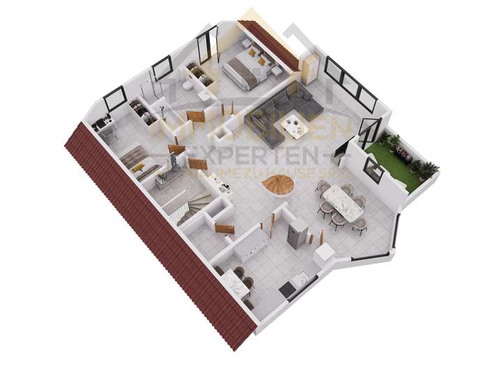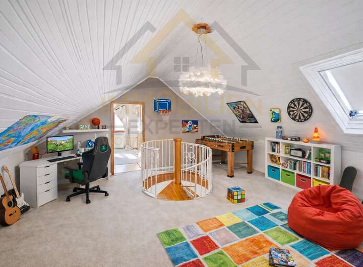 Im Dachgeschoss lädt eine charmante Loggia zum Verweilen ein und bietet einen geschützten Rückzugsort mit Ausblick ins Grüne. Mehrere Terrassen rund um das Haus schaffen zusätzliche Lieblingsplätze im Freien – ideal zum Entspannen, Genießen oder für gesellige Stunden mit Familie und Freunden.
