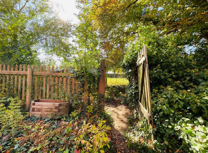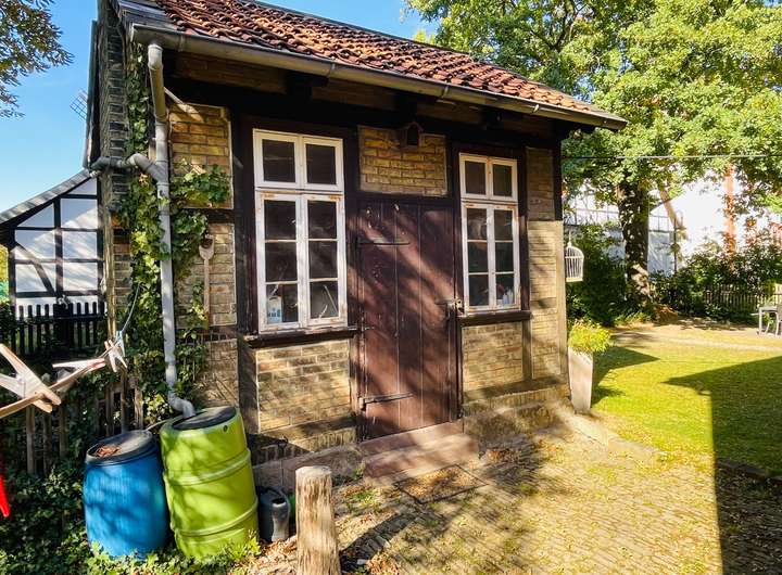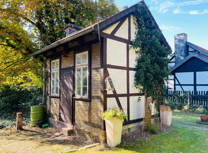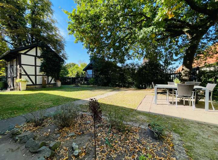 Das Grundstück selbst ist eine kleine Oase. Der gepflegte Garten bietet großzügige Grünflächen, einen geschützten Freisitz für entspannte Sommerabende und einen charmanten Fachwerkschuppen, der sich ideal als Atelier, Hobbyhaus oder Sommer-Homeoffice eignet. Ein unauffälliger Nebenbau sorgt für Ordnung und hält Alltägliches aus dem Blick. Der Vorgarten mit eigener Zufahrt heißt Bewohner und Gäste gleichermaßen willkommen – hier fühlt man sich sofort zuhause.
