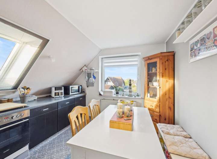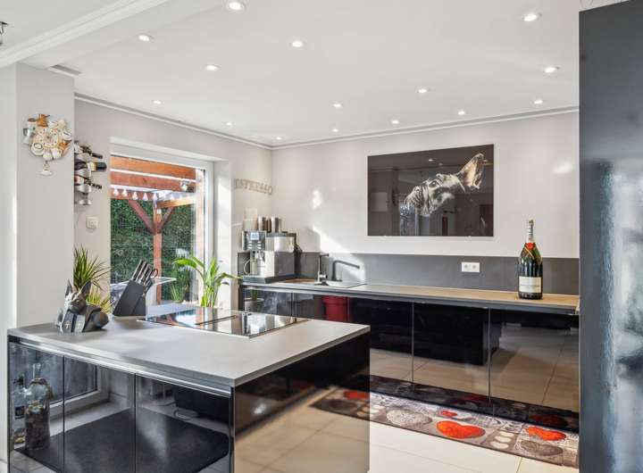 Die Einbauküche ist neuwertig und mit sämtlichen elektrischen Geräten ausgestattet. Die modernen schwarzen Fronten setzen stilvolle Akzente zu den hellen Bodenfliesen. Eingelassene Deckenstrahler runden das Bild geschmackvoll ab.