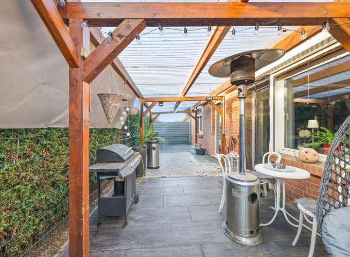 -eine überdachte Terrasse am Haus, eine überdachte Terrasse im hinteren Teil des Gartens