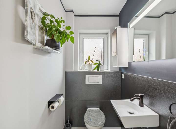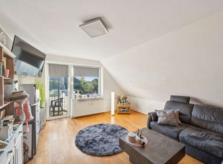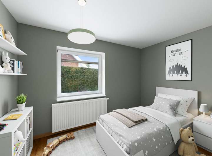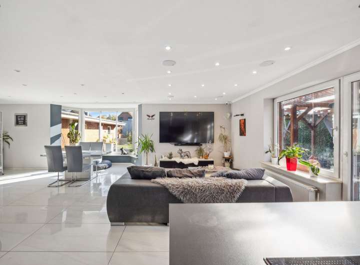 Die Erdgeschosswohnung gliedert sich in einen offenen, lichtdurchfluteten Wohn- und Essbereich mit integrierter Küche, einen Flur, ein Gäste-WC sowie zwei weitere Zimmer und ein Vollbad.