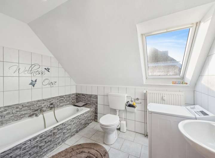 -Badezimmer mit Wanne, Dusche, und Fenster aus dem Baujahr