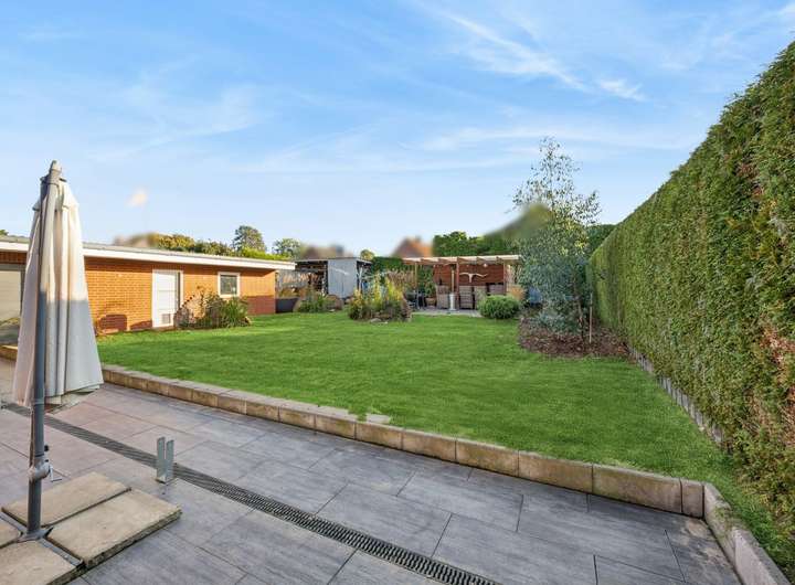 -pflegeleichte Rasenfläche mit eingewachsener Hecke an der Grundstücksgrenze
