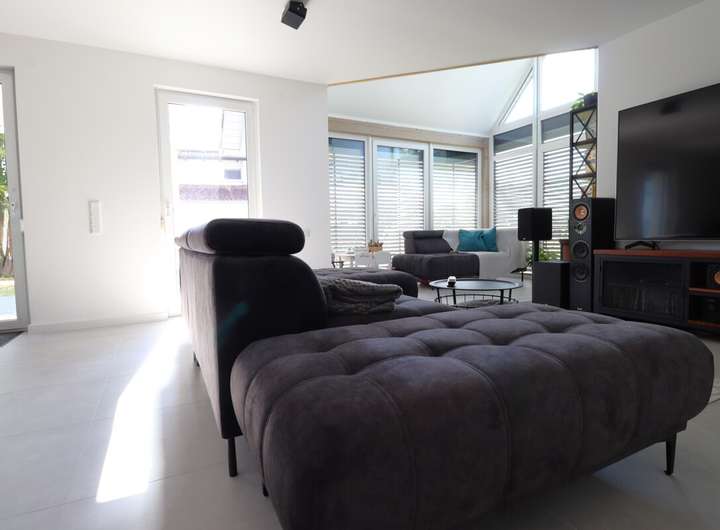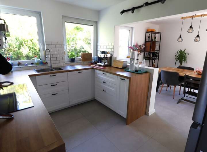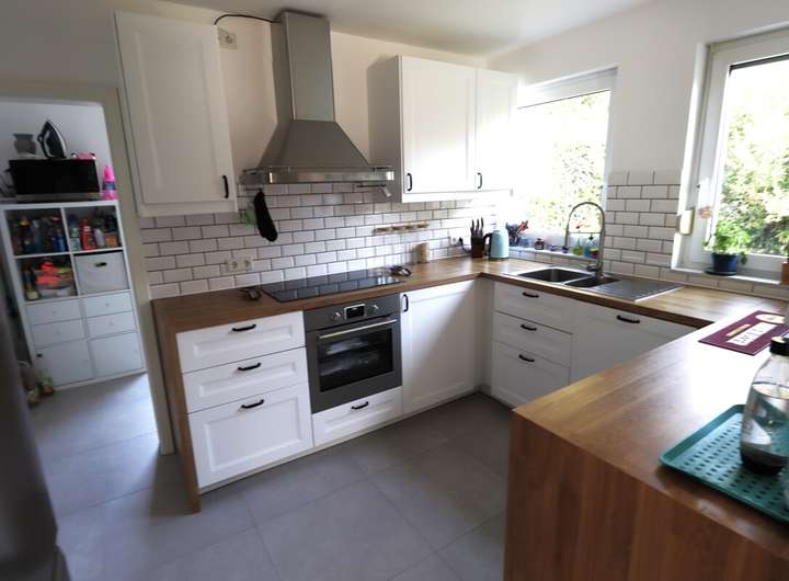 Ein besonderes Highlight ist die offene Küche mit einer modernen, hellen Einbauküche, die fließend in den Wohn- und Essbereich übergeht. Hier haben Sie genug Raum, um kulinarische Köstlichkeiten zu zaubern und gesellige Stunden mit Familie und Freunden zu genießen. Wohlige Wärme und Gemütlichkeit strahlt der im Wohnzimmer integrierte Kaminofen aus, der besonders an kühleren Tagen einladend ist.
