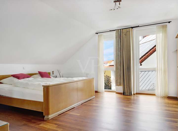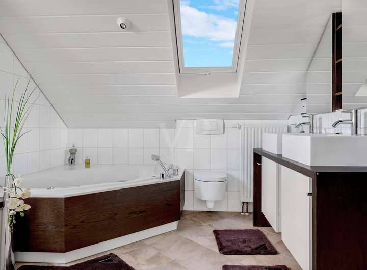 Im Dachgeschoss erwartet Sie ein großzügiges Schlafzimmer sowie eine offen gestaltete Galerie, die flexibel als Arbeitsbereich, Bibliothek oder Spielzone genutzt werden kann. Möglich wäre hier auch das Einziehen einer Wand, um ein weiteres, abgeschlossenes Zimmer auf dieser Ebene zu generieren, falls der Bedarf besteht. Das großzügige Master-Bad sorgt für Komfort im Alltag – mit Eckbadewanne, Dusche und hochwertigen Einbauschränken.