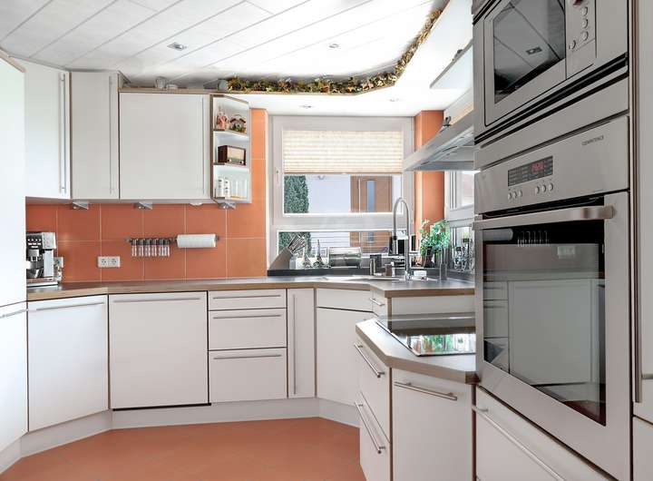 Das Erdgeschoss besteht im Wesentlichen aus einem geräumigen und lichtdurchfluteten Wohn- und Essbereich. Das Herzstück dieses Bereiches stellt der an die Gas-Zentralheizung angeschlossene Kachelofen dar. Vom Essbereich gelangt man zu einer der drei Terrassen des Hauses, auf der man den Feierabend wunderbar genießen kann. Die abgeschlossene Küche ist mit hochwertigen Einbaugeräten ausgestattet und bietet viel Stauraum, der durch die angrenzende Speisekammer ergänzt wird. Ein Badezimmer mit Dusche, sowie ein vielseitig nutzbares Zimmer, runden das Raumangebot auf dieser Ebene ab.