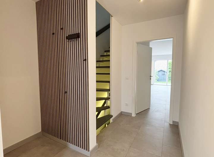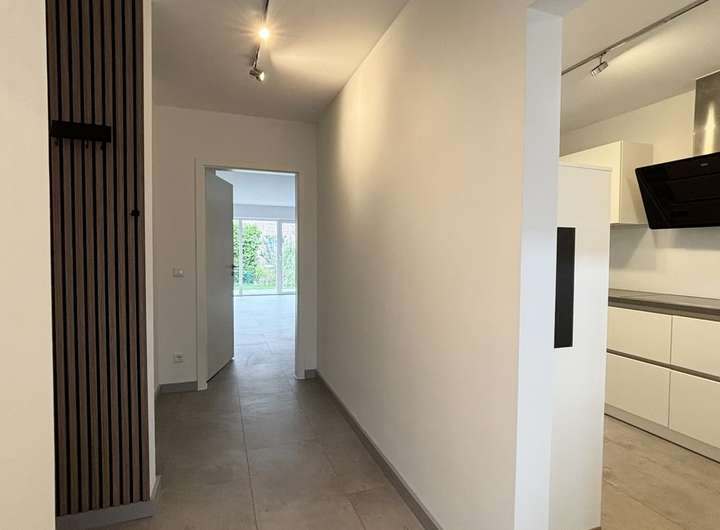 Beim Betreten des Hauses empfängt Sie ein einladender Flurbereich, der nahtlos in den offenen Wohn- und Essbereich übergeht. Die moderne Küche ist mit hochwertigen Geräten ausgestattet und bietet viel Platz für kulinarische Entfaltung. Große Fensterfronten im Wohnzimmer sorgen für ein helles und freundliches Ambiente und eröffnen den Blick auf den gepflegten Garten.