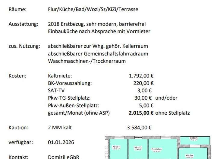 | Gesamtmiete | 2.015 € (zzgl. Heizkosten) |
