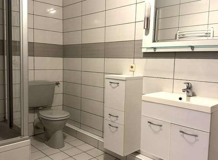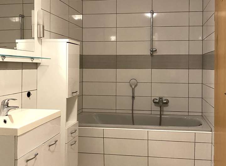 Das zeitlose Bad im Dachgeschoss ist mit Dusche und Wanne ausgestattet.