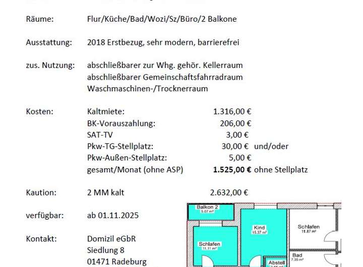 | Gesamtmiete | 1.525 € (zzgl. Heizkosten) |