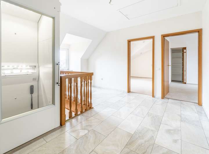 Das Obergeschoss erreichen Sie komfortabel über eine Treppe oder den eigenen Aufzug. Hier erwarten Sie zwei gemütliche Schlafzimmer, ein Wohnzimmer (ebenfalls über die Einliegerwohnung erreichbar) sowie ein voll ausgestattetes Badezimmer mit Zugang zur Loggia. Ein weiteres Highlight ist der private Wellnessbereich mit Whirlpool, Sauna, großzügiger Dusche, separatem WC sowie einem Ruhe- oder Fitnessraum.