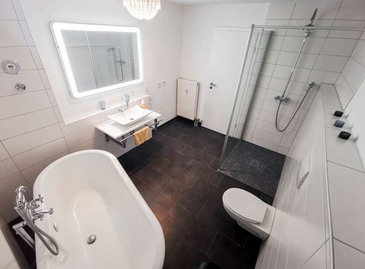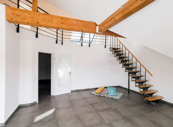 Im unteren Bereich der Wohnung befindet sich außerdem das Badezimmer, sowie ein weiteres Zimmer, das sich ideal als Büro, Kinder- oder Gästezimmer nutzen lässt. Über eine elegante Treppe gelangt man auf die Galerieebene, die zusätzlichen Raum für individuelle Gestaltungsmöglichkeiten bietet – ob als Rückzugsort, Leseecke oder Hobbybereich. Zusätzlich befindet sich ein weiteres Zimmer auf dieser Ebene, das sich ideal als Schlafzimmer eignet.