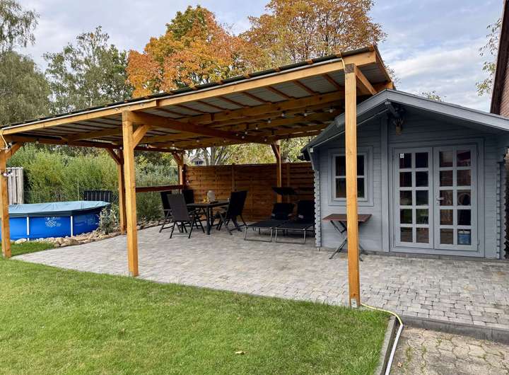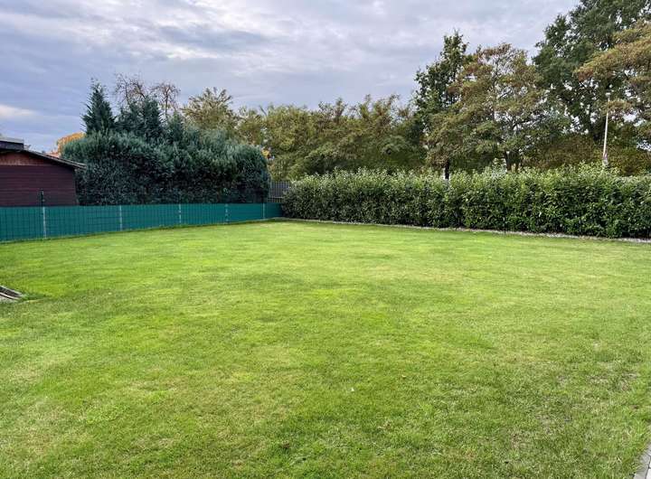 Das großzügige Grundstück von 911 m² beherbergt eine beeindruckende Grünfläche von über 400 m², ideal für entspannte Nachmittage im Freien oder lebhafte Familienaktivitäten. Abgerundet wird die Fläche mit der angrenzenden überdachten Terrasse, nebst Gartenhütte.