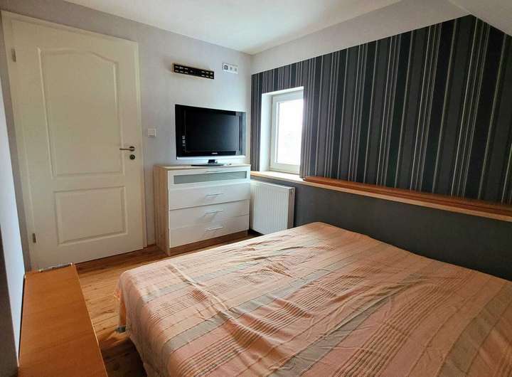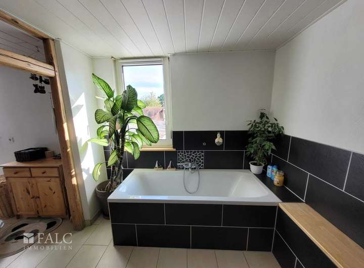 Zwei Schlafzimmer bieten ausreichend Platz für Kleiderschränke und Sideboards, während das großzügige Badezimmer mit Badewanne, Dusche und sichtbaren Balken ein echtes Highlight darstellt.