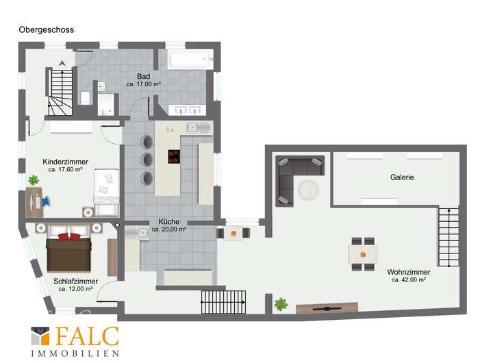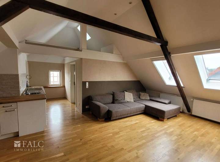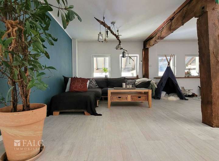 Das 1. Obergeschoss wurde umfassend modernisiert. Dabei wurden die Fachwerkelemente bewusst erhalten und verleihen den Räumen einen ganz besonderen Charme. Das Wohnzimmer beeindruckt mit ca. 42 m² Wohnfläche, einer Galerie und einer hellen, offenen Atmosphäre durch zahlreiche Fenster.