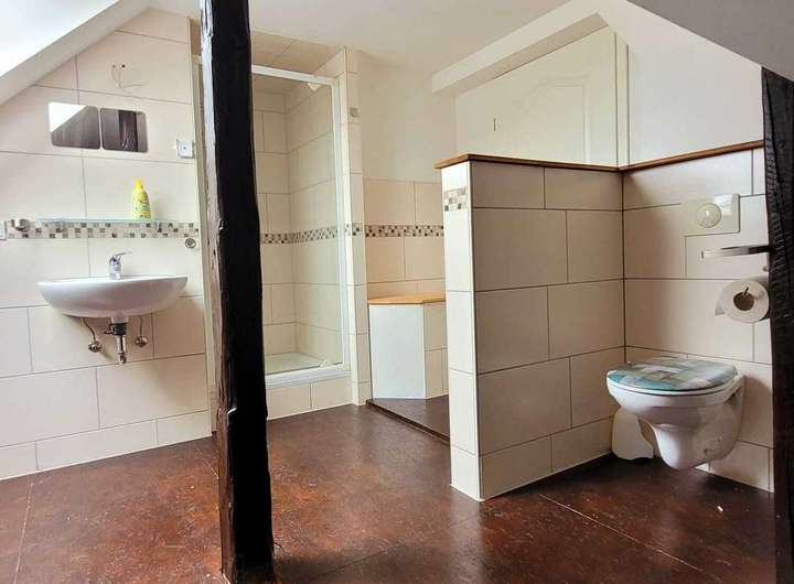 Hier befindet sich aktuell eine gemütliche 2-Zimmer-Wohnung, die derzeit vermietet ist. Die langjährige Mieterin würde gerne in der Wohnung bleiben – eine ideale Gelegenheit, um mit den Mieteinnahmen die Finanzierung zu unterstützen. Neben den zwei Zimmern verfügt diese Einheit über eine große Küche und ein Badezimmer.