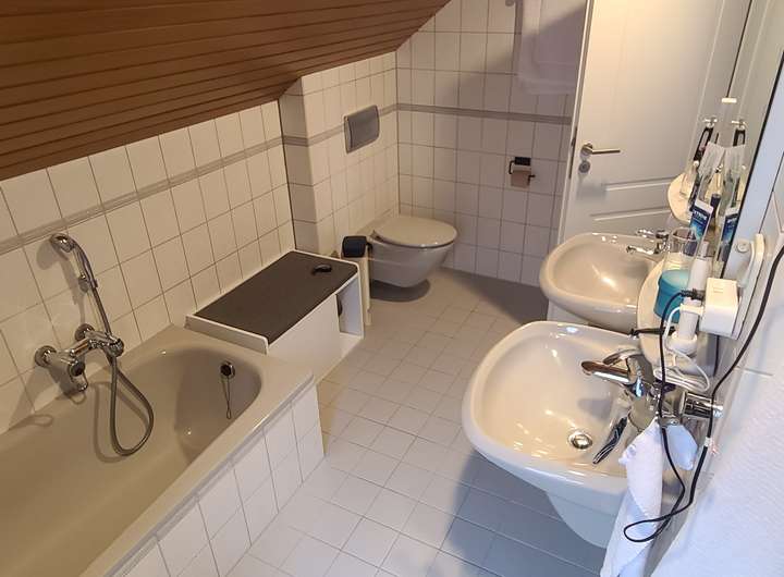 Das Gebäude ist technisch und optisch einwandfrei unterhalten, verfügt über eine Gas-Brennwertheizung aus dem Jahr 2018, eine Photovoltaik-Anlage, einen effizienten Kachelofen, Marmor- und Parkettböden, ein Tageslichtbad mit Dusche und Wanne, weiterhin ist ein separates Gäste-WC vorhanden.