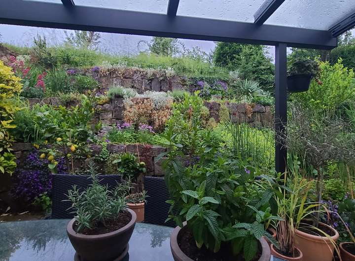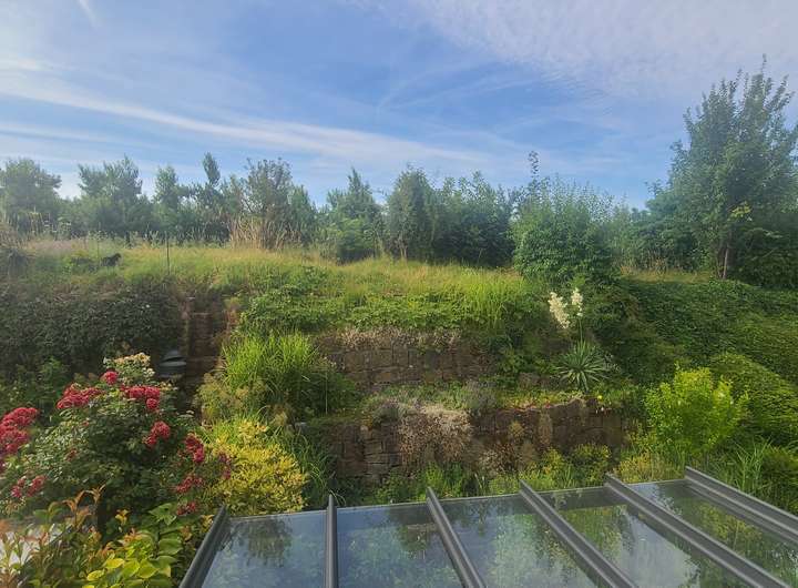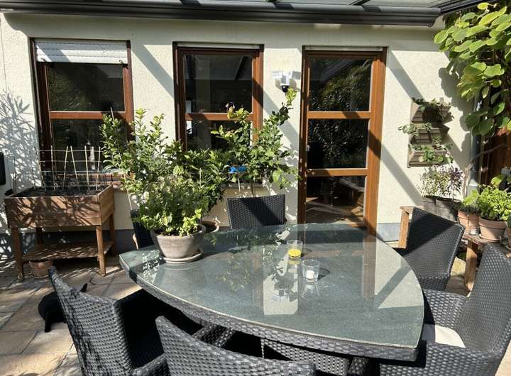 Die ruhige, zur Bebauungsgrenze gelegene Wohnlage wird Sie beeindrucken. Die große sonnige und überdachte Terrasse und die liebevoll angelegten Gartenflächen bieten Ihnen einen nahezu uneinsehbaren privaten Rückzugsort. Die hochwertige Konstruktion der Überdachung und der Markise ermöglichen fast ein Wintergarten-Feeling.