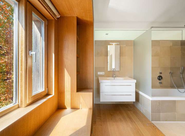 - Masterbad mit Eichenparkett und Solnhofener Platten gestaltet, ausgestattet mit Wanne, Waschtisch, WC, beleuchtetem Spiegel, Handtuchwärmer, Schreinereinbauten, Deckenspots und Oberlicht zum Treppenhaus