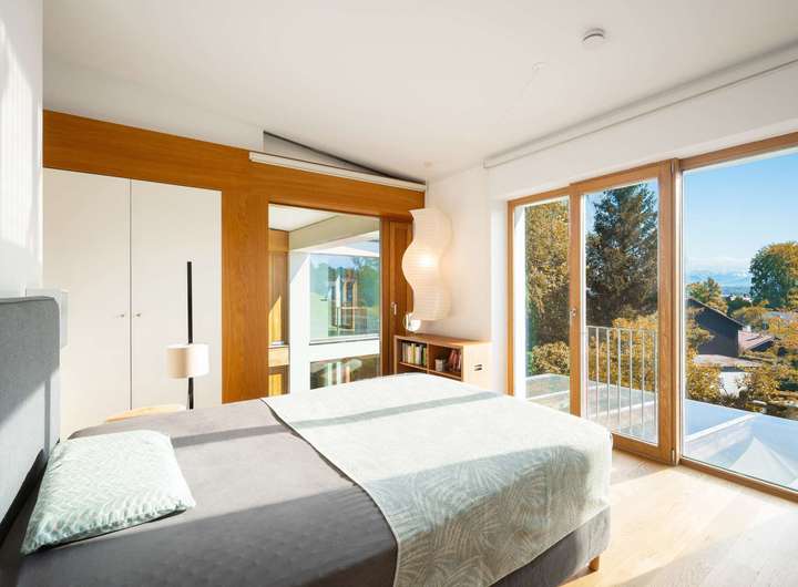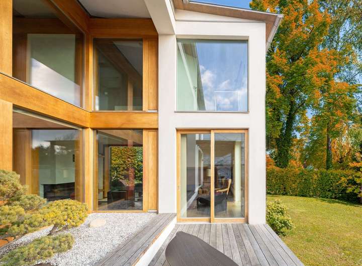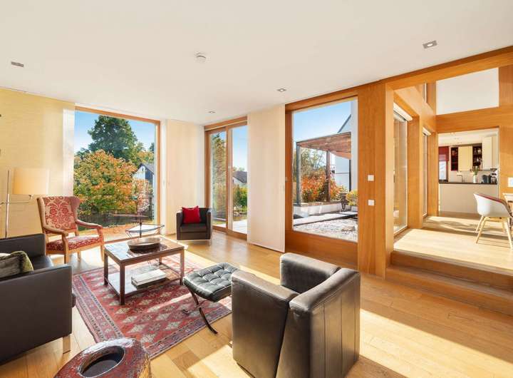 Dieses attraktive, freistehende Einfamilienhaus befindet sich in absolut ruhiger Lage oberhalb des Tutzinger Ortskerns und ist in einen prächtigen grünen Garten eingebettet. Große Glasfronten, warmes Eichenholz und eine fernöstliche Klarheit verschmelzen zu einer eindrucksvollen Architektur, die sich harmonisch in die Umgebung einfügt. Das 2009 erbaute Haus lebt von Offenheit und Großzügigkeit und bietet zugleich klar gegliederte, funktionale Räume und einen familienfreundlichen Grundriss.