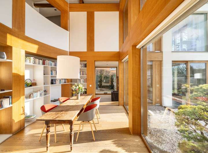 Die Räumlichkeiten präsentieren sich auf ca. 219 m² und erstrecken sich über zwei Etagen. Im Erdgeschoss finden Wohnen, Essen, Kochen, ein Duschbad, ein Gästezimmer und eine Garderobe Platz. Das Obergeschoss beherbergt einen Masterbereich mit Bad en suite und Ankleide, drei nahezu gleichwertige (Kinder-)Zimmer, ein Arbeitszimmer und ein Duschbad. Im Untergeschoss liegen neben einem Hauswirtschafts- und Technikraum zwei weitere Räume mit Stauraum- und Ablageflächen. Hinzu kommt ein gut belichteter Hobbyraum. Der traumhaft gestaltete Süd-Garten bietet neben sonnigen Terrassen lauschige Sitzplätze, Rasenflächen zum Spielen und einen hübschen Teich. Geheizt wird mit einer Wärmepumpe.