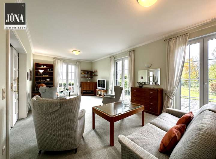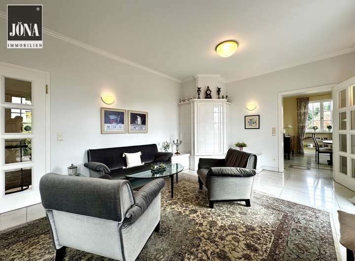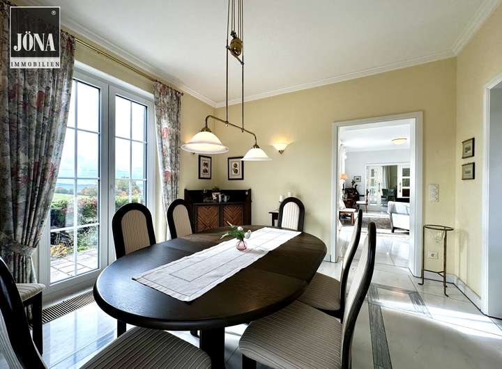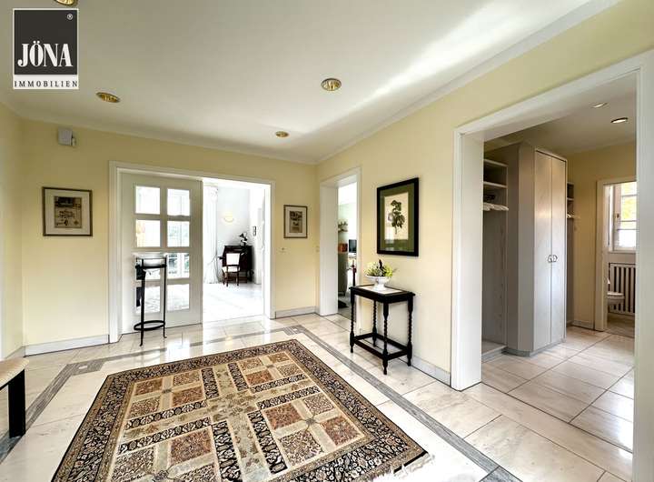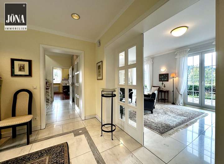 Bereits beim Betreten empfängt Sie eine großzügige Diele mit edlem Marmorboden, stilvollen Einbauten und einem offenen Übergang zu den Wohnräumen. Großformatige, bodentiefe Fenster durchfluten die Räume mit Licht und eröffnen den Blick auf die weitläufige Terrasse und den gepflegten Garten.