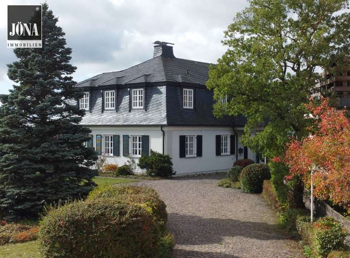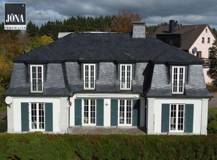 Die Außenansicht mit traditionellem Schieferdach und klar gegliederter Fassade vermittelt stilvolle Beständigkeit und fügt sich harmonisch in die ruhige Umgebung ein.Die weitläufige Terrasse und der gepflegte Garten bieten viel Platz für Erholung und Privatsphäre.