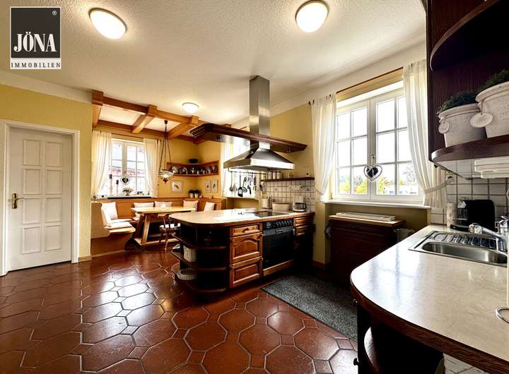 Die gemütliche Landhausküche mit Essecke lädt zum Verweilen ein und wird durch eine separate Speisekammer ergänzt.