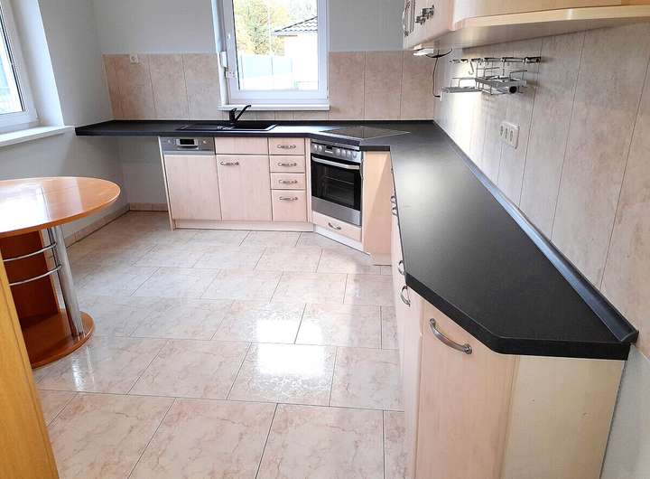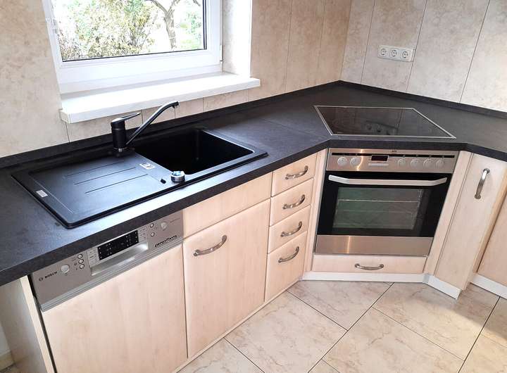 - Einbauküche (ohne Kühlschrank) mit Spülmaschine, Spülbecken und neuer Armatur, Backofen,