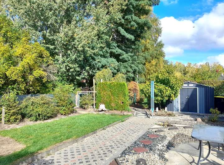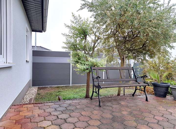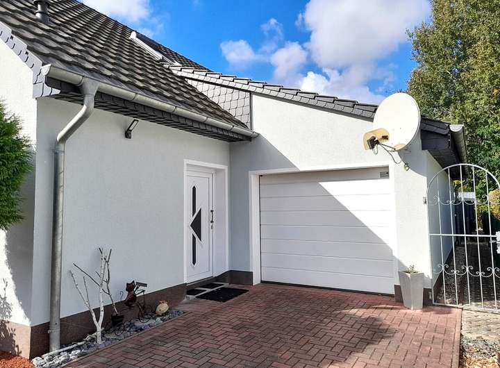 Das Grundstück ist übersichtlich, eingefriedet und pflegeleicht gestaltet. Eine Garage und eine gepflasterte Zufahrt runden das Angebot ab.