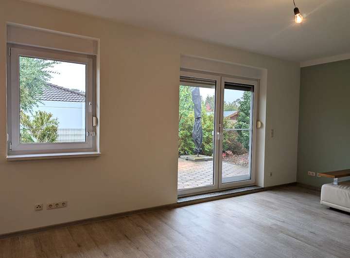 Das Erdgeschoss überzeugt mit einem hellen Wohnbereich und großen Fensterflächen, die den Blick auf die Terrasse freigeben. Die vorhandene Einbauküche fügt sich praktisch ins Gesamtbild ein. Ergänzt wird die Etage durch ein Schlafzimmer, ein Gäste-WC mit Dusche sowie einen Hauswirtschaftsraum.