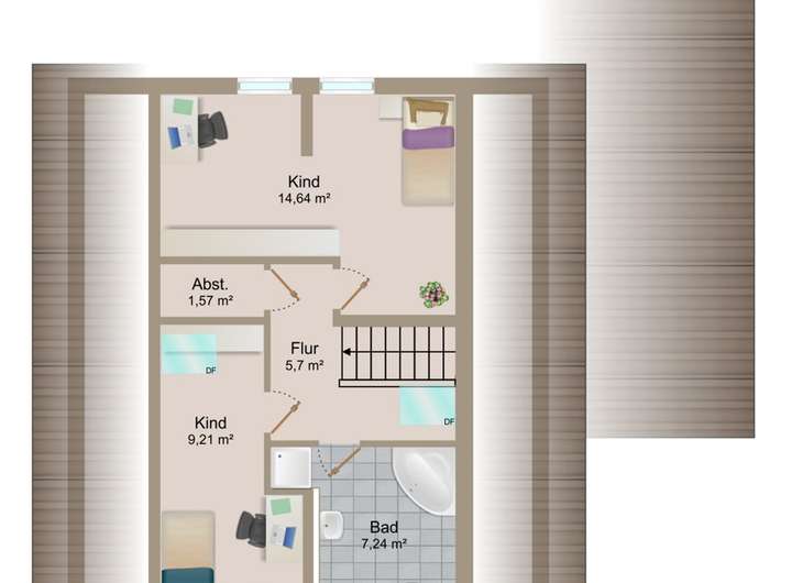 Im Dachgeschoss stehen zwei weitere Zimmer zur Verfügung, die sich flexibel als Kinderzimmer, Arbeits- oder Hobbyräume nutzen lassen. Ein Tageslichtbad mit Badewanne, sowie eine kleiner Abstellraum mit Dachfenster komplettieren das Raumangebot.