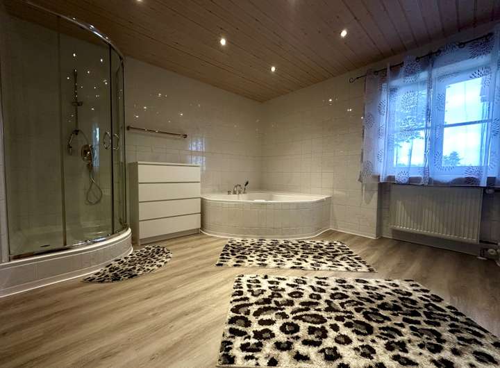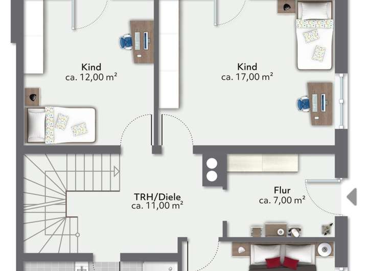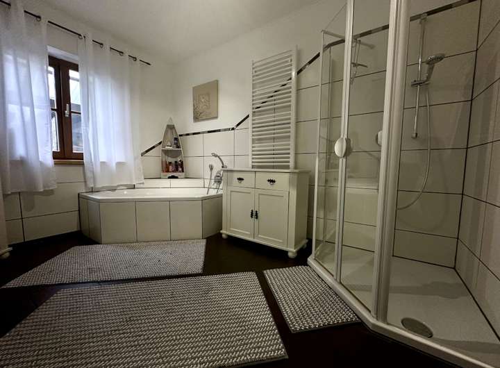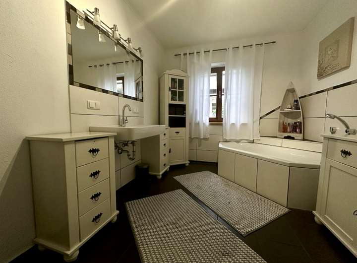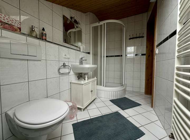 Das Obergeschoss bietet neben 3 Zimmern noch ein weiteres Badezimmer mit WC. Von zwei der Zimmern haben Sie Zugang zum Balkon. Sie sehen also, von Elternschlafzimmer über Kinderzimmer bis hin zu Gästezimmer oder Büro sind Ihnen hier wenig Grenzen gesetzt.