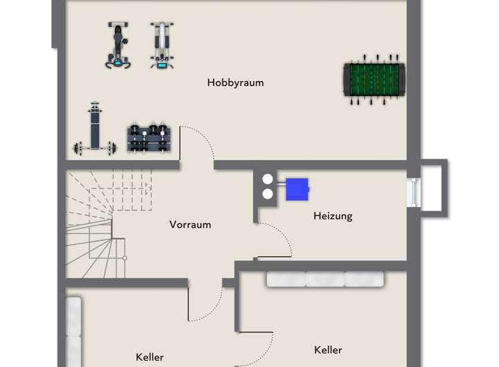 Das Kellergeschoss überzeugt ebenfalls. Neben ausreichend vorhanden Räumen für die Verstauung der nicht alltäglich gebrauchten Gegenstände haben Sie zusätzlich noch einen tollen Hobbyraum.