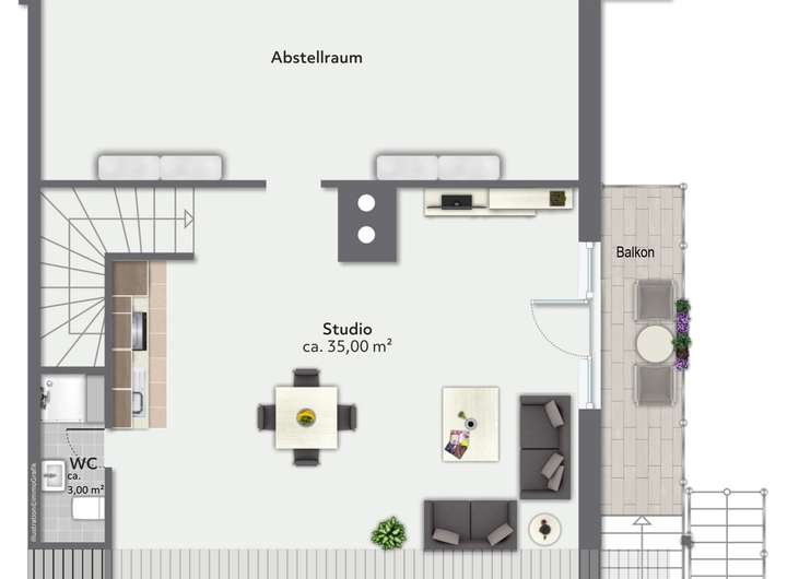 Das ausgebaute Dachgeschoss bietet neben dem großzügigen Studio noch ein weiteres Duschbad und eine geräumige Abstellkammer.