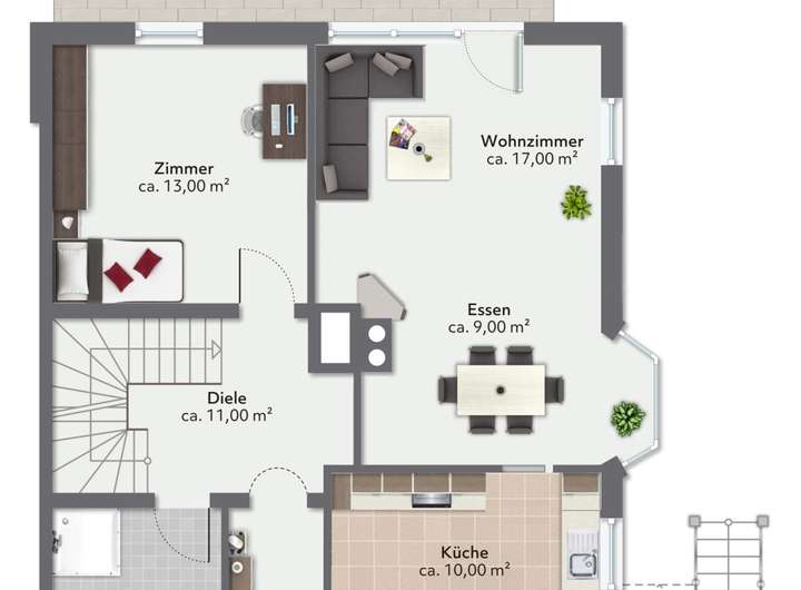 Im Erdgeschoss begrüßt Sie ein geräumiger Eingangsbereich mit genügend Platz für Garderobe und ähnliches. Unterteilt in Gäste-WC, sep. Küche, Speisekammer, einem Badezimmer, dem geräumigen Wohn bzw. Esszimmer sowie einem weiteren Zimmer haben Sie eine Vielzahl an Möglichkeiten für ein angenehmes Familienleben.