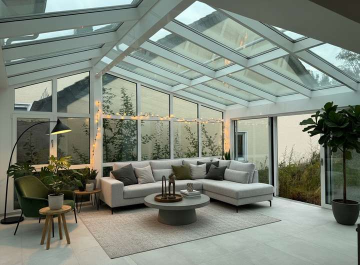 Auf großzügigen 232,97 m² Wohnfläche erstreckt sich das Haus über mehrere versetzte Wohnebenen, die fließende Übergänge schaffen und eine beeindruckende räumliche Tiefe erzeugen. Herzstück ist der weitläufige Wohnbereich mit ca. 3 Metern Deckenhöhe, einem stilvollen Wintergarten und direktem Zugang zur sonnigen Terrasse sowie zum frei gestaltbaren Gartenbereich.