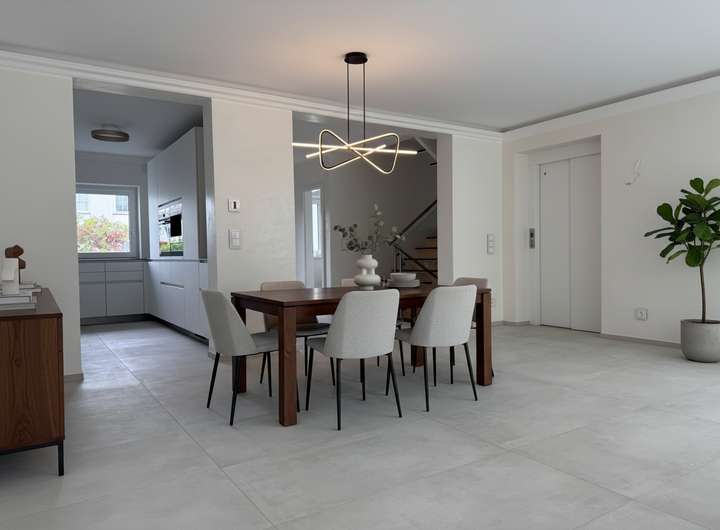 Die gehobene Ausstattung dieser kernsanierten Immobilie wurde 2022 bis 2025 mit höchstem Anspruch vollständig modernisiert. Der offene Wohnbereich mit 3 Meter Deckenhöhe und stilvollem Wintergarten schafft ein großzügiges Raumgefühl, während die hochwertige Einbauküche mit Markengeräten zum gemeinsamen Kochen einlädt. Die exklusive Stucco Veneziano-Spachteltechnik an allen Wänden verleiht jedem Raum luxuriöses Ambiente. Das moderne Smart-Home-System steuert Beleuchtung, Raumklima, Sicherheit und witterungsabhängige Rollladenautomatik am Wintergarten. Der barrierefreie Aufzug erschließt alle Etagen vom Keller bis zum Dachstudio, die integrierte Garage verfügt über eine beheizbare Zufahrt.