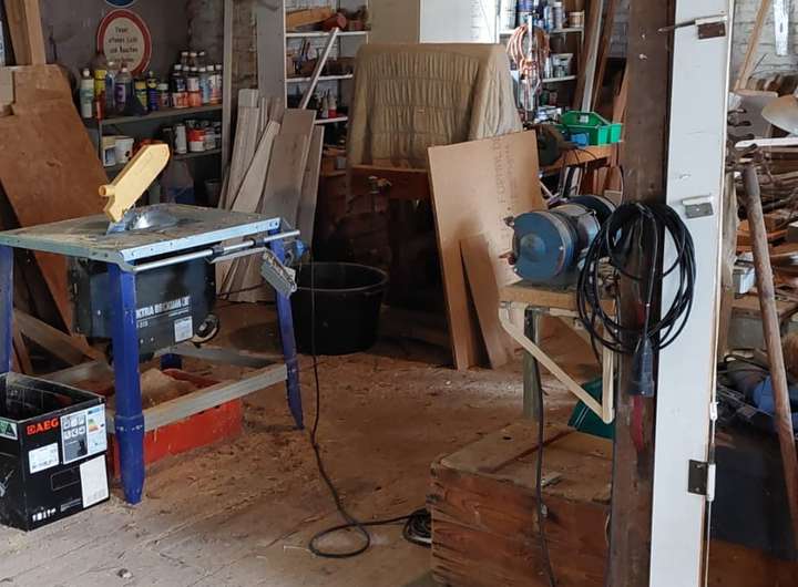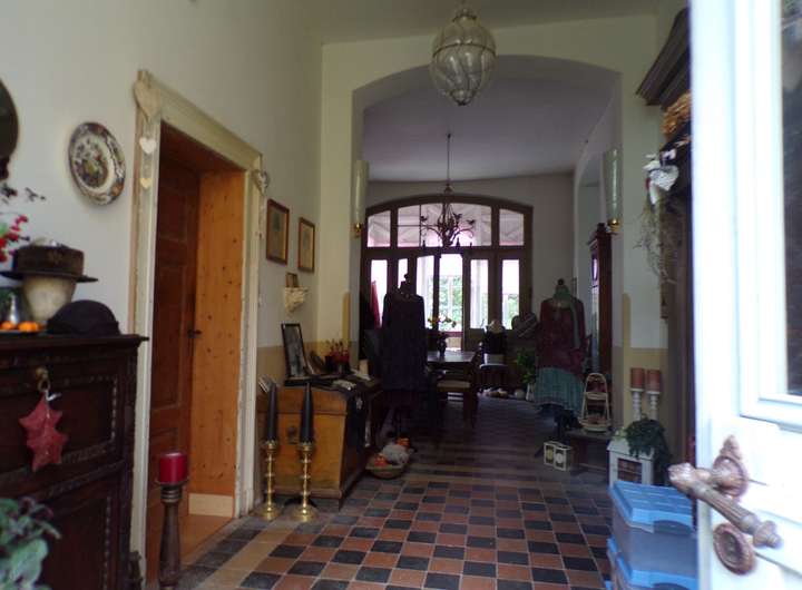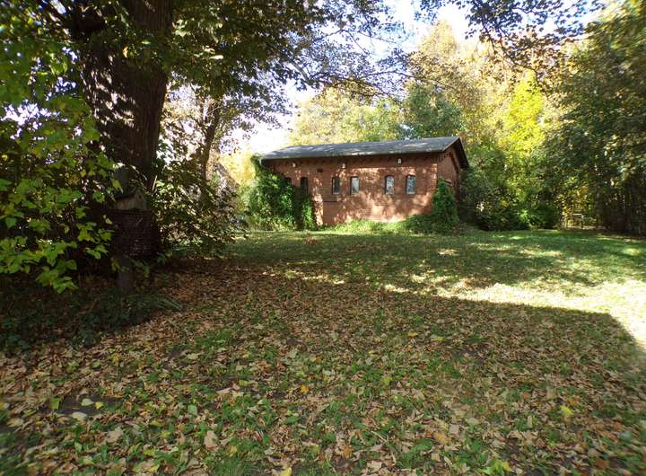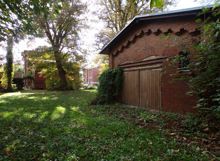 Auf dem 1026 m² großen Grundstück befindet sich linksseitig vom Bahnhof noch eine große Garage und eine Wiese.